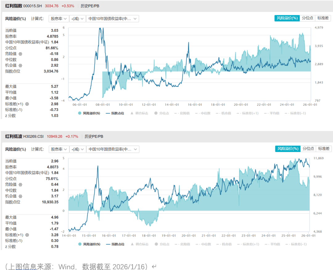 到1月16日为止,红利指数的风险溢价高于指数发布(05/1/4)以来81.66%的时间,红利低波的风险溢价则高于指数发布(13/12/19)以来75.61%的时间,基本都来到历史高位了。